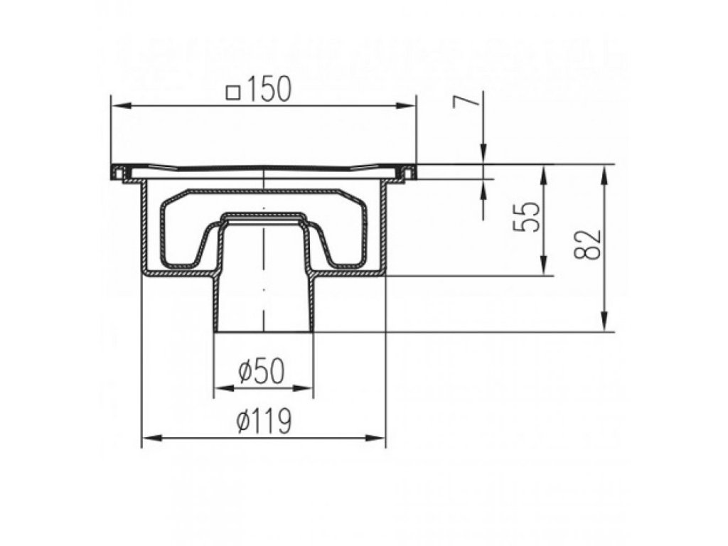 Podlahová vpusť spodná DN50/55, mriežka biely plast 150, vodná hladina