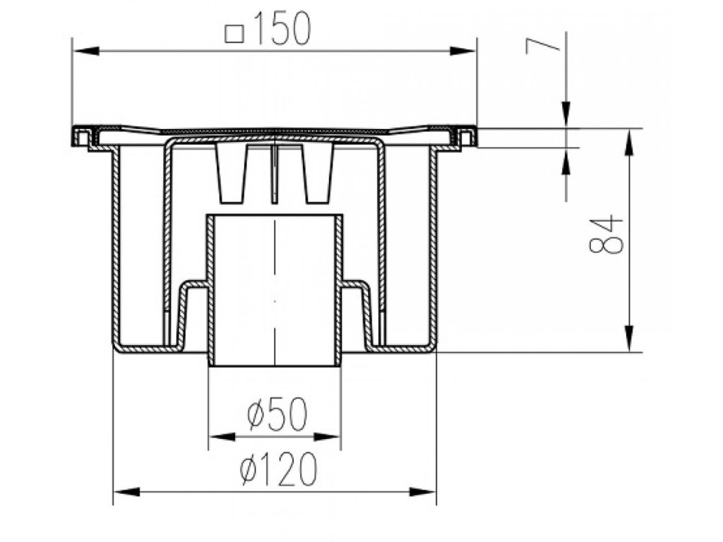 Podlahová vpusť spodná DN50/84, mriežka biely plast 150, vodná hladina