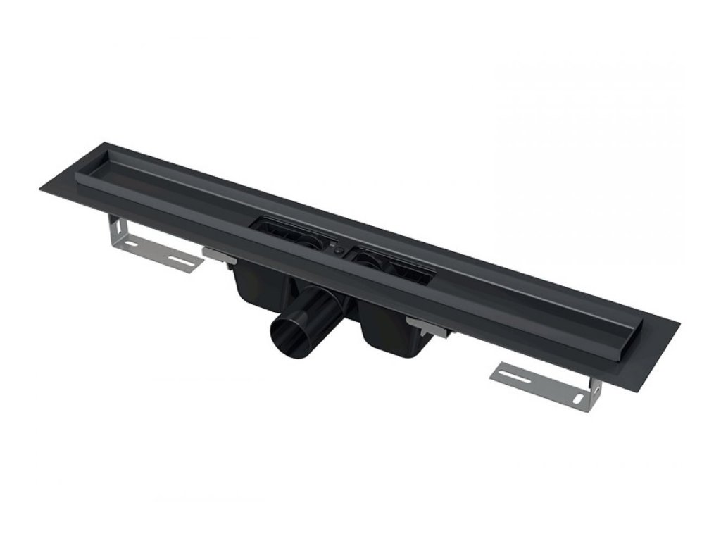 Podlahový žľab značky Alcaplast, s okrajom pre perforovaný rošt, v matnej čiernej povrchovej úprave.