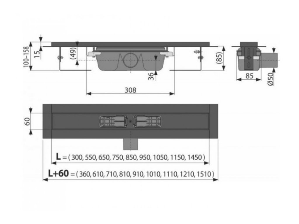 Podlahový žľab značky Alcaplast, s okrajom pre perforovaný rošt, v matnej čiernej povrchovej úprave.