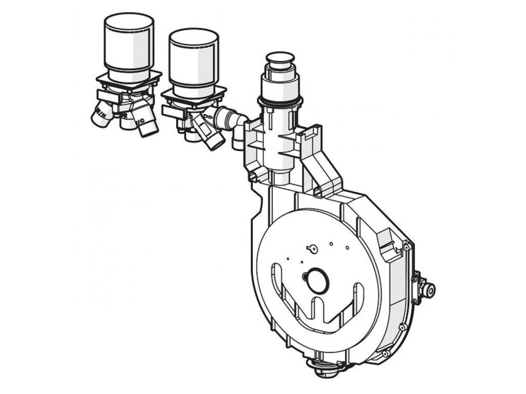 Základné podomietkové montážne teleso pre sprchové a vaňové 3-otvorové vodovodné batérie. S otočným prepínačom.