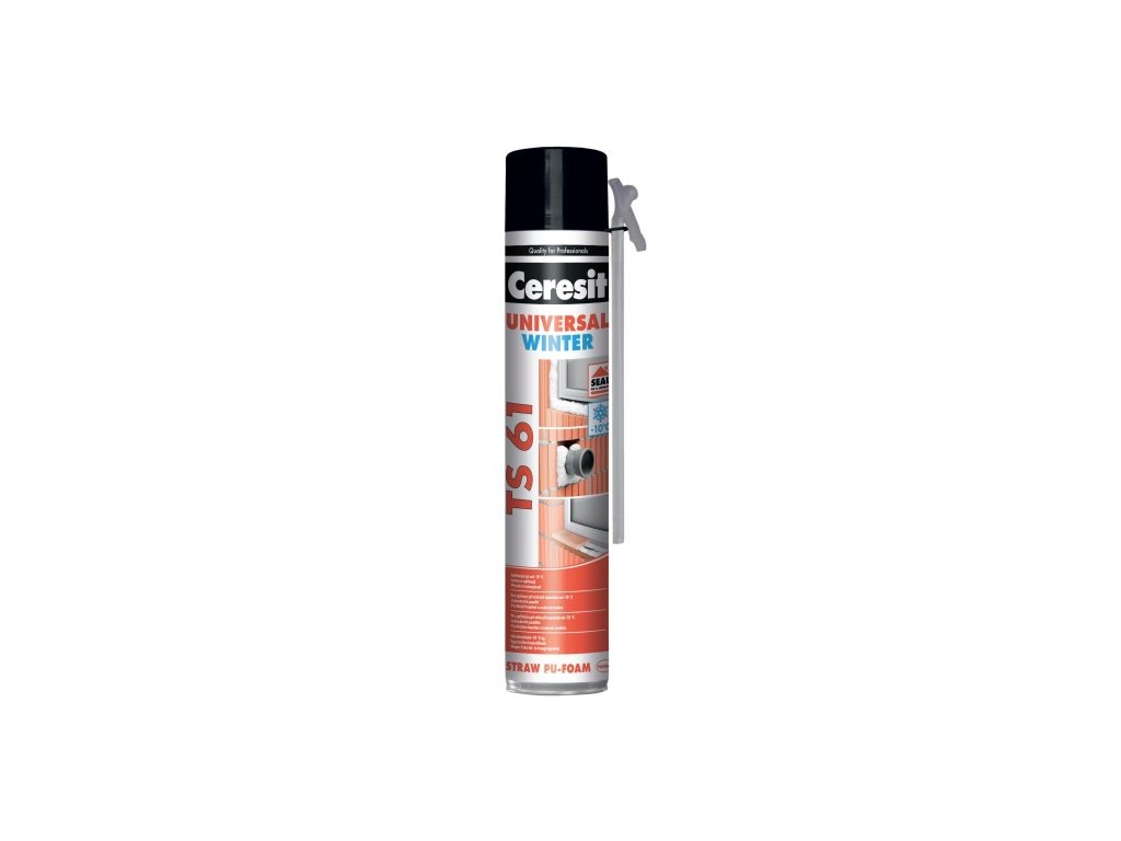 Ceresit TS 61 Zimná je jednozložková zimná trubičková PU pena značky HENKEL vytvrdzujúca vzdušnou vlhkosťou, vhodná pre montáž okenných a dverných rámov, vyplňovanie dutín, utesňovanie otvorov v strešných konštrukciách a v izolačných materiáloch, vytváranie zvukotesných stien, vyplňovanie medzier okolo potrubí, fixácia a izolovanie stenových panelov, strešných krytín a pod. Pena je samorozpínavá a výborne priľne k drevu, betónu, kameňu a ku kovom.