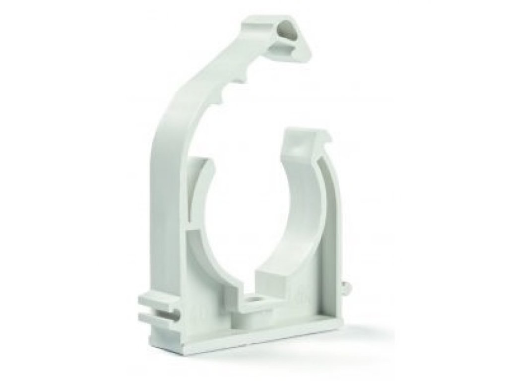Príchytka na potrubie, s klipom, biely plast - 28mm