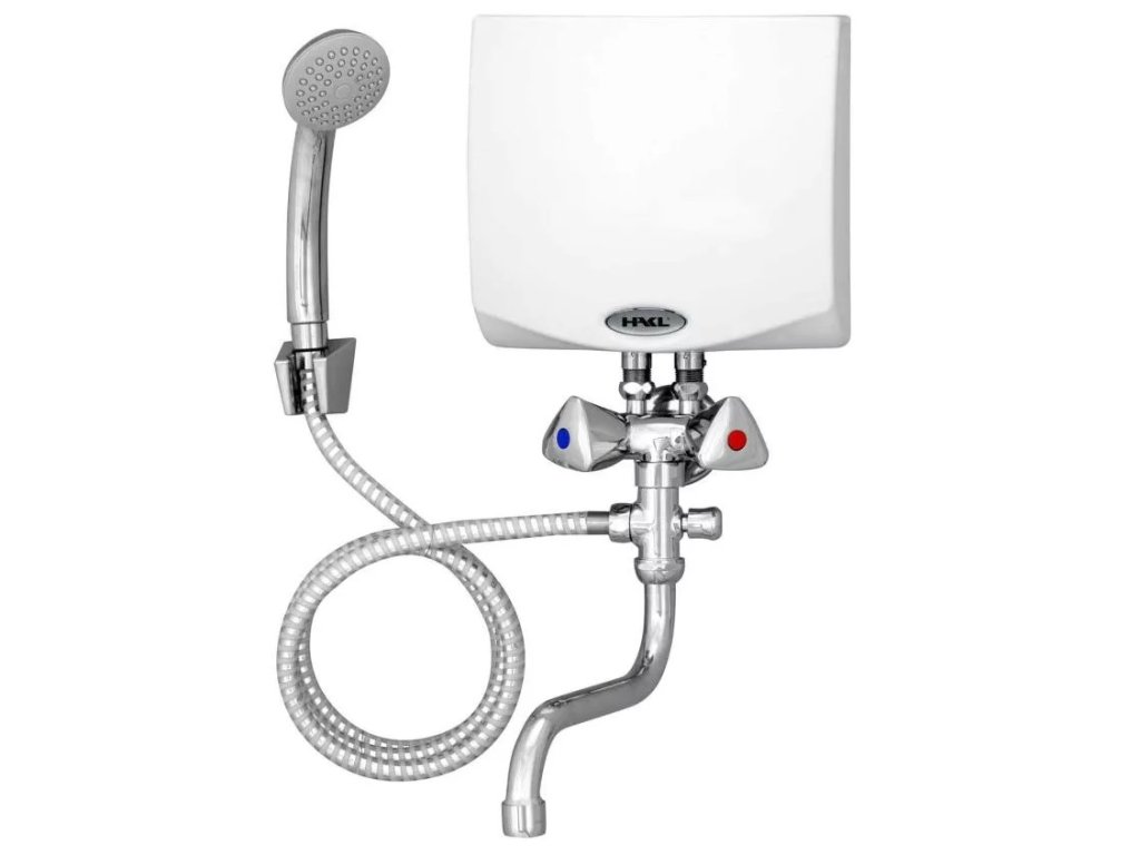 Sprchový set značky HAKL pozostáva z prietokového ohrievača, klasickej vaňovej batérie a sprchového setu.