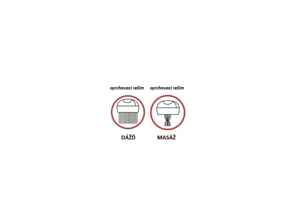 Plastová ručná sprcha s možnosťou prepnutia medzi dvomi režimami prúdu: dážď a masáž.