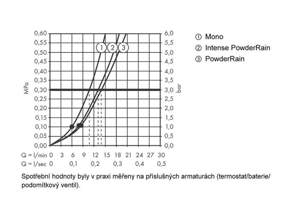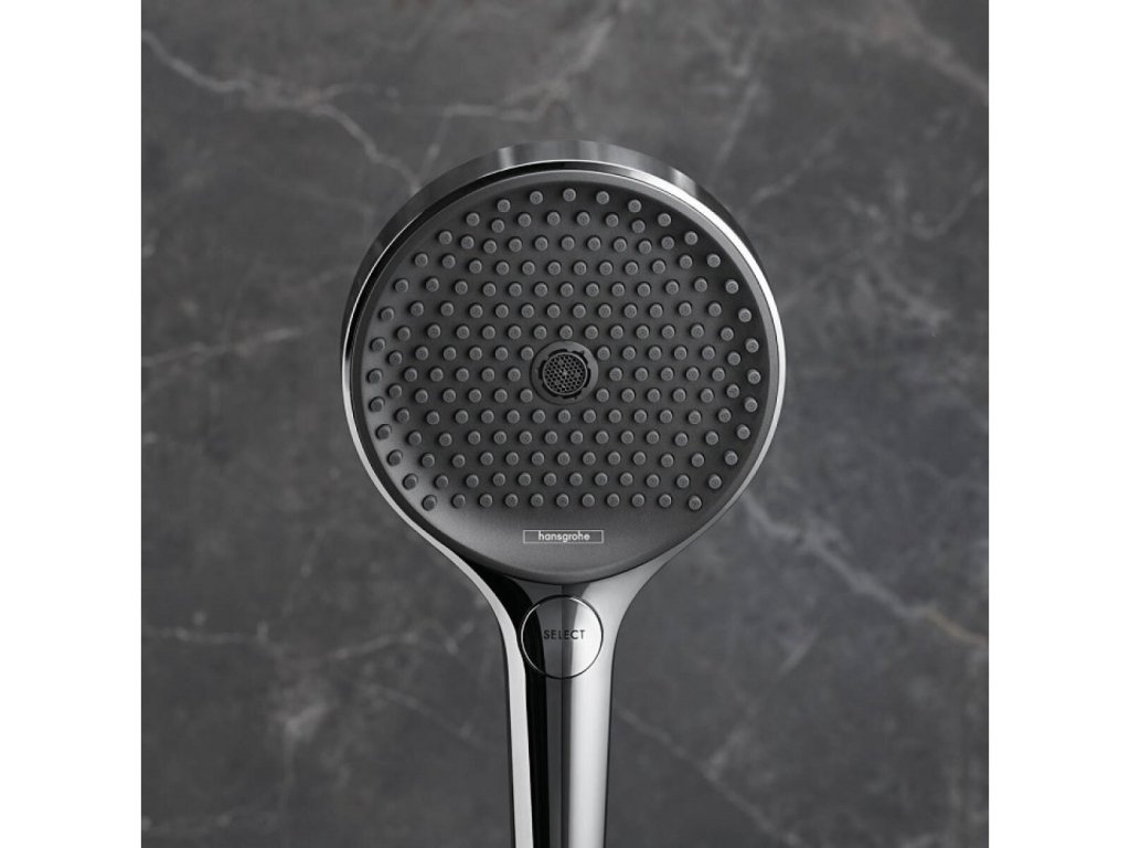 RAINFINITY je 3-polohová ručná sprcha s druhmi prúdu PowderRain, Intense PowderRain, MonoRain, ktoré možno prepínať tlačidlom Select.