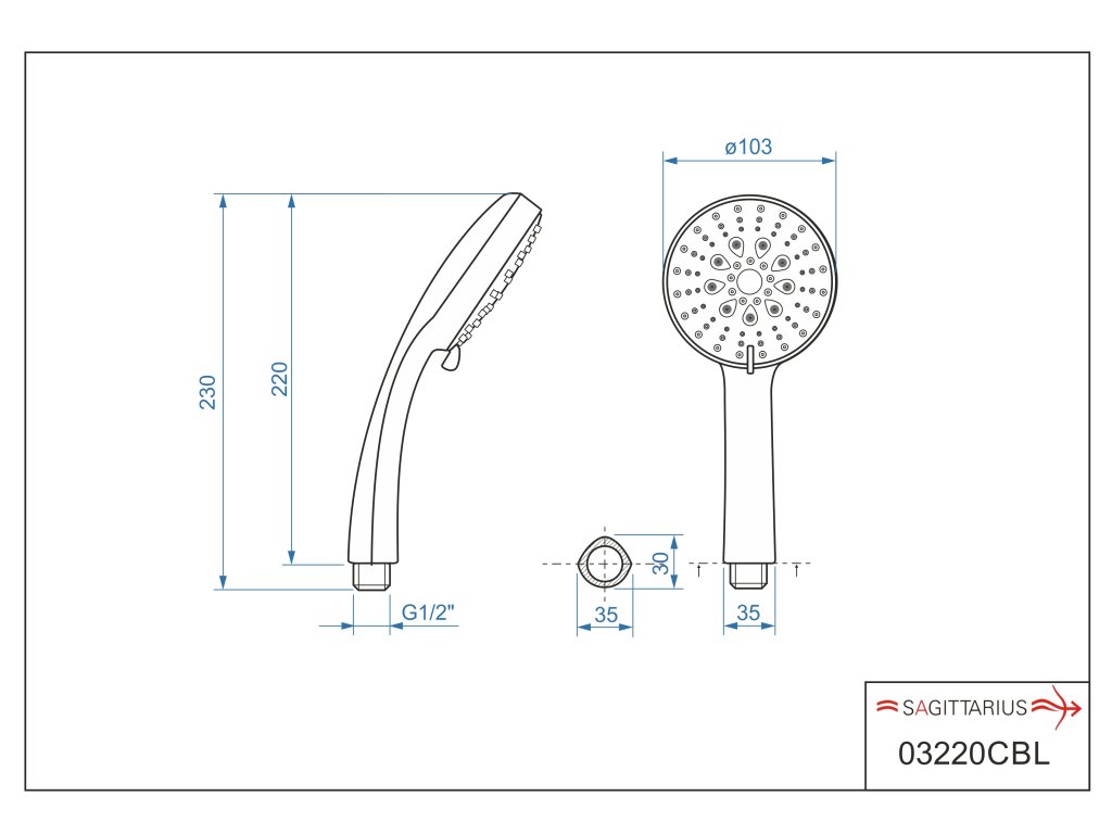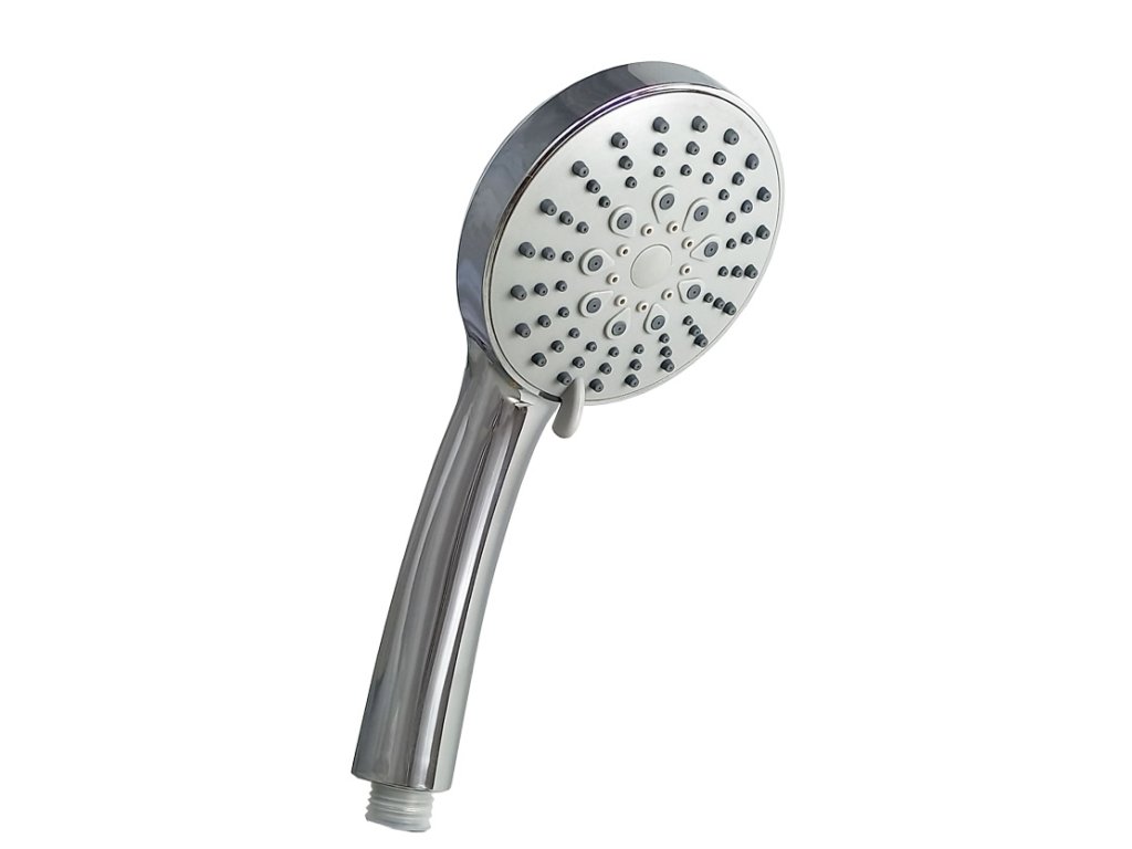 Plastová ručná sprcha s možnosťou prepnutia medzi piatimi režimami prúdu: dážď, sauna, masáž, dážď+masáž, dážď+sauna.