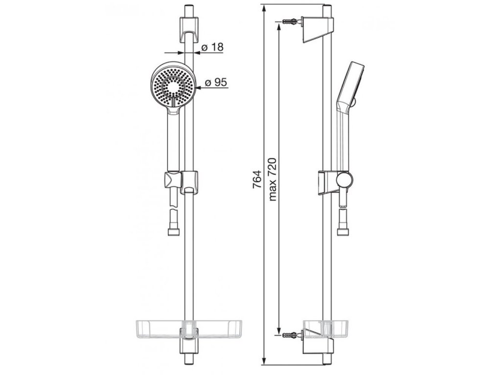 • sprchová tyč s nastaviteľnou roztečou úchytov, dĺžka 720 mm, priemer 18 mm.