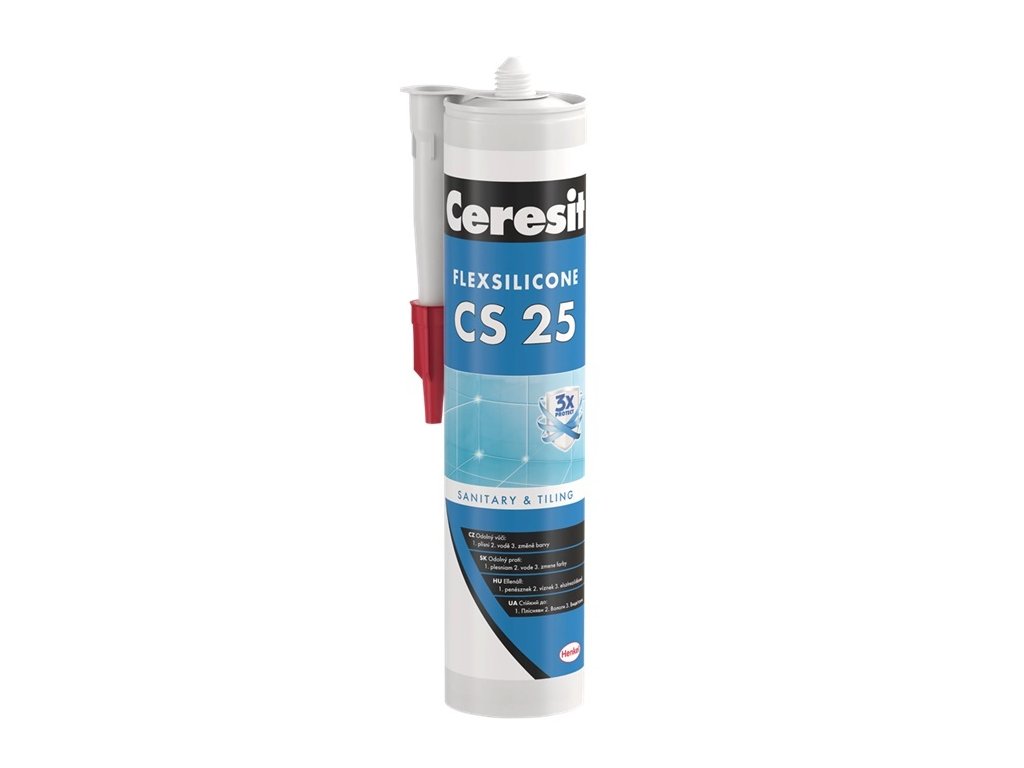 Sanitárny silikón Ceresit CS 25 je určený na vyplnenie dilatačných a spojovacích škár medzi keramickými obkladmi a dlažbou v rohoch alebo v styku stien, podláh a na osadzovanie zriaďovacích predmetov v sanitárnej oblasti. Je určený na vyplňovanie škár tam, kde bežné škárovacie hmoty vykazujú trhliny a praskliny. Vďaka trvalej elasticite a odolnosti proti vode je vhodný do oblastí trvalo zaťažených vlhkosťou: kuchyne, sprchy, kúpeľne, toalety, balkóny, terasy a pod. Unikátna receptúra TrioProtect chráni silikón pred napadnutím plesňami, hubami a inými nežiaducimi mikroorganizmami.