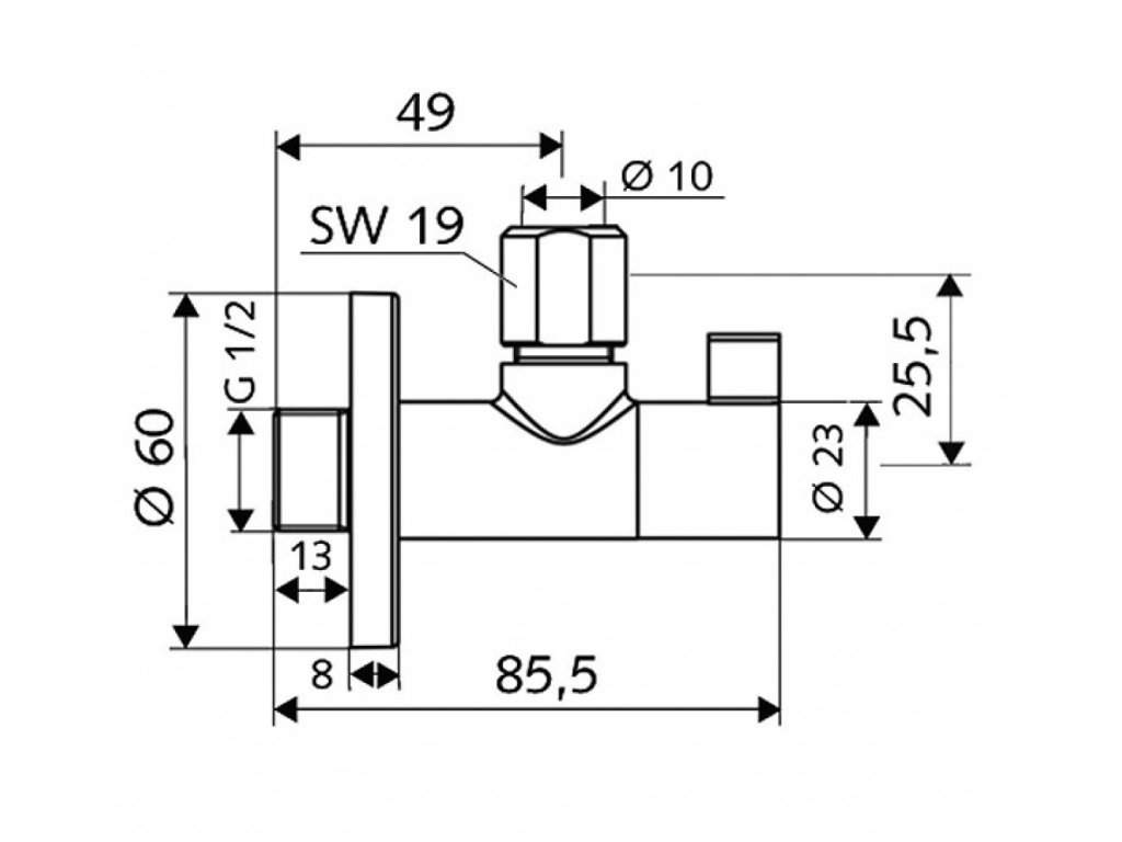 Designový regulačný rohový ventil značky Schell, s posuvnou krycou ružicou O 60 mm.