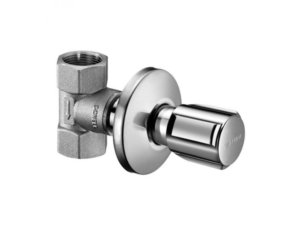 Uzatvárateľný a regulačný podomietkový vretenový ventil značky SCHELL, s rukoväťou COMFORT, s predĺženým driekom a posuvnou rozetou.