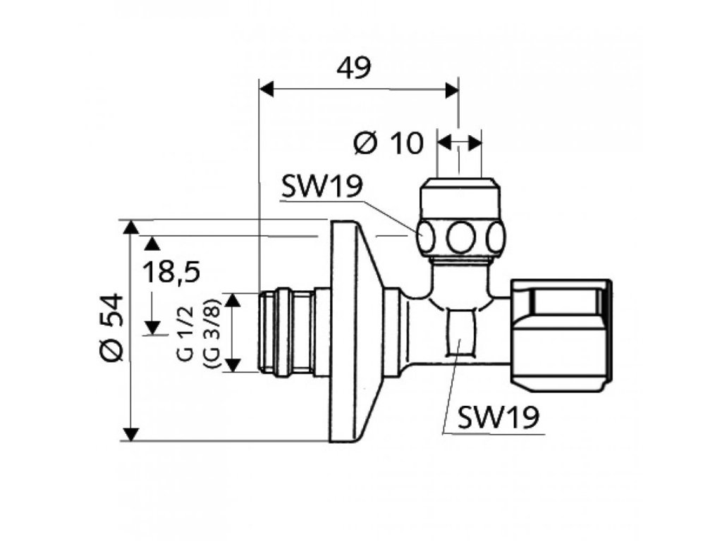 Rohový regulačný ventil značky Schell, s rukoväťou COMFORT a s filtrom, so samotesniacim prípojným závitom. S dlhým driekom a posuvnou rozetou O 54 mm.