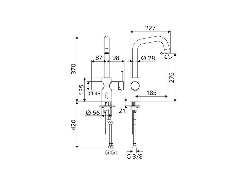 - 2 flexibilné pripojovacie hadice G 3/8 vnútorný závit x 450 mm, so spätnou klapkou (RV, DIN EN 1717: EB) a predfiltrom.