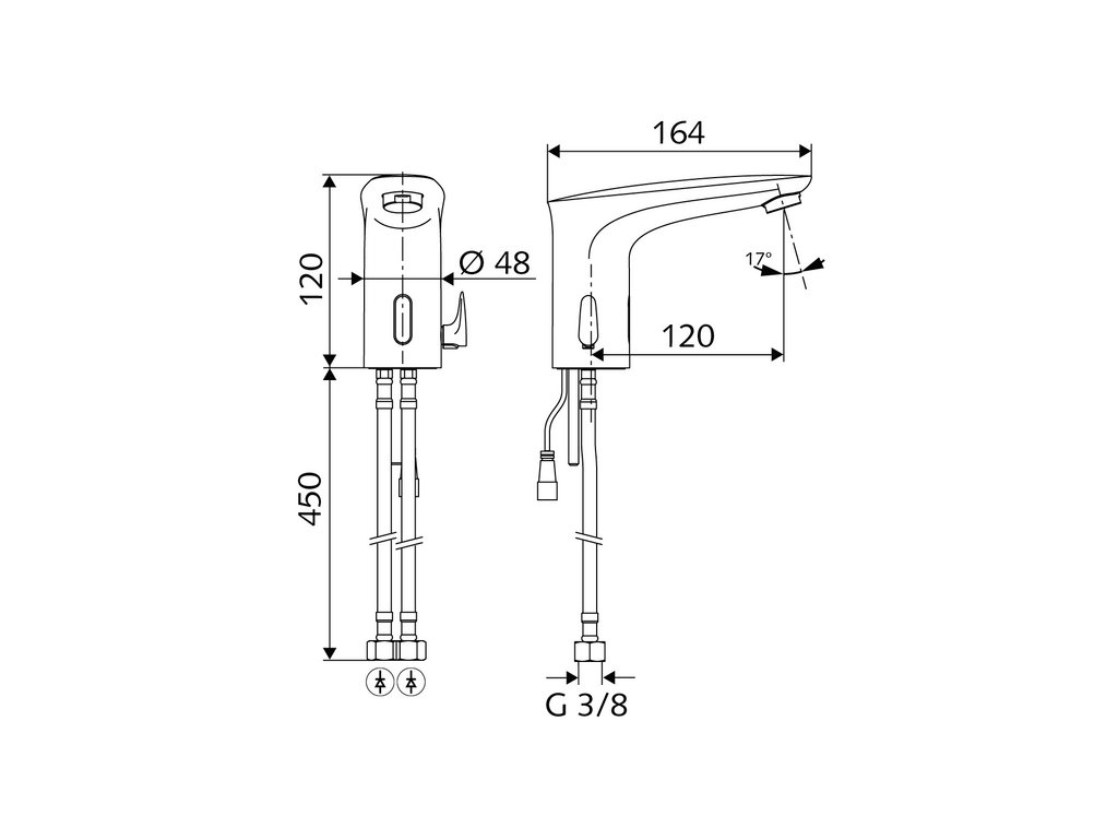 - dve flexibilne pripojovacie hadice G 3/8 vnútorný závit x 450 mm, so spätnou klapkou (RV, DIN EN 1717: EB) a predfiltrom.