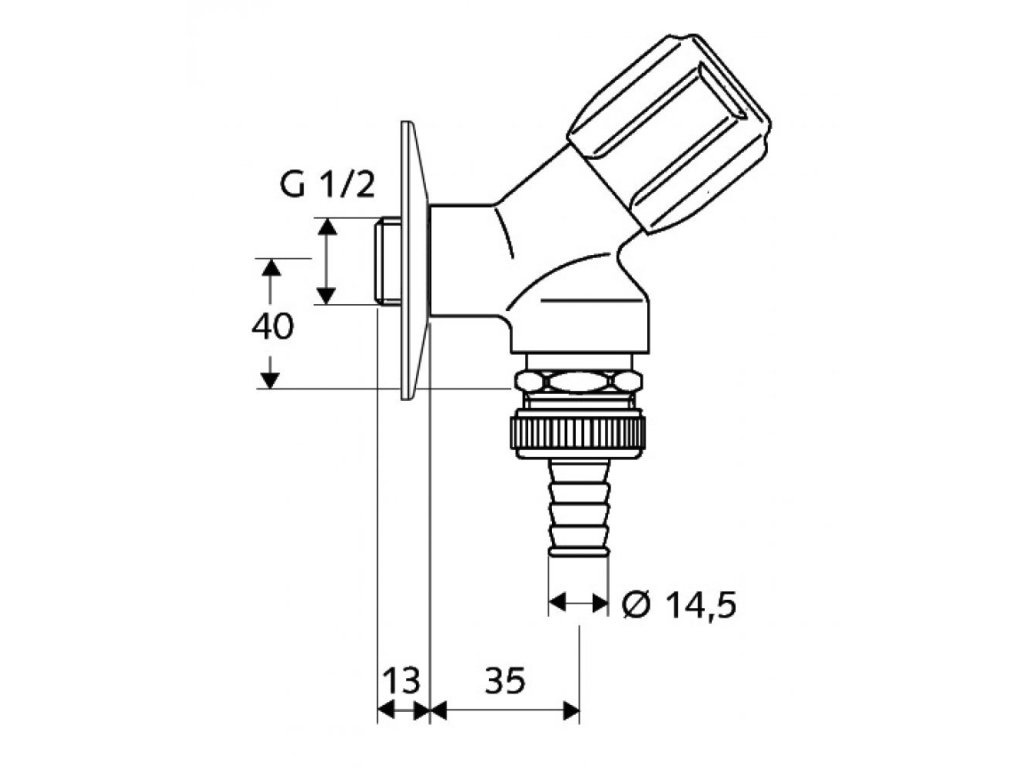 Prístrojový šikmý ventil s hadicovou prípojkou, s rukoväťou COMFORT., so spätnou klapkou a so šróbením na hadicu.