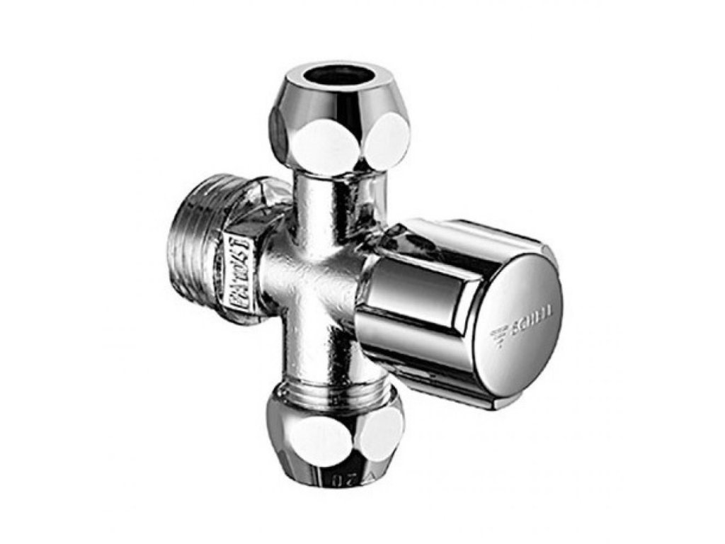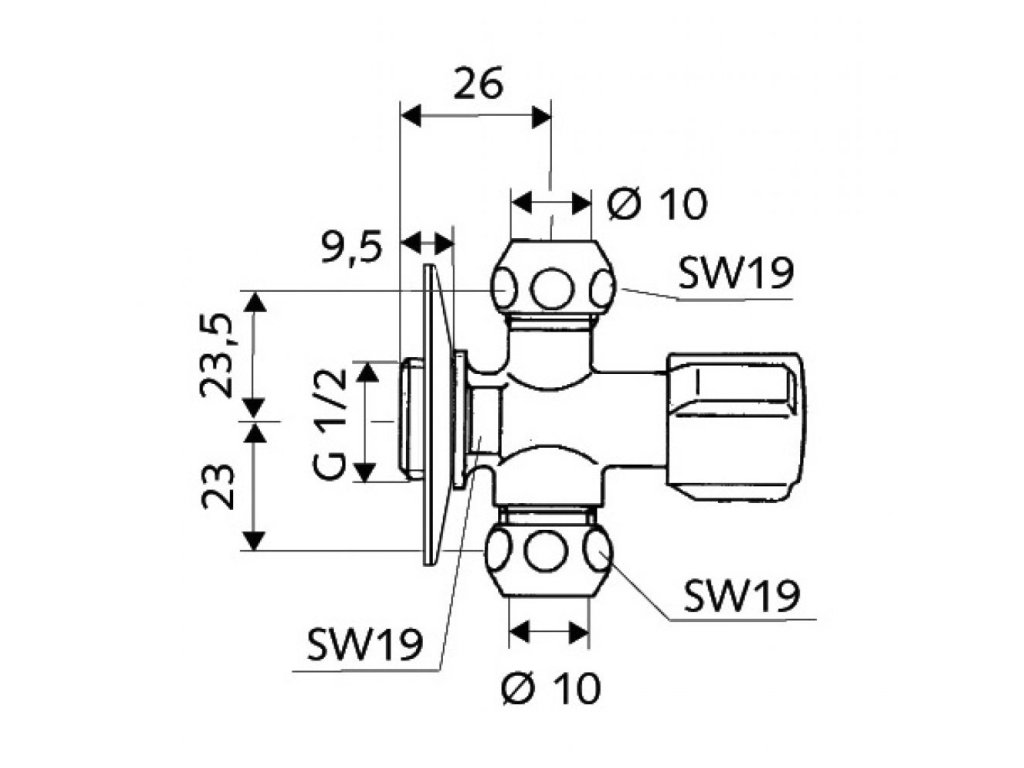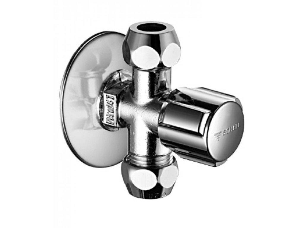Rohový ventil značky Schell, s rukoväťou COMFORT, krátke prevedenie, s dvomi 3/8" výstupmi pre medené trúbky O 10 mm. S rozetou o 54 mm.