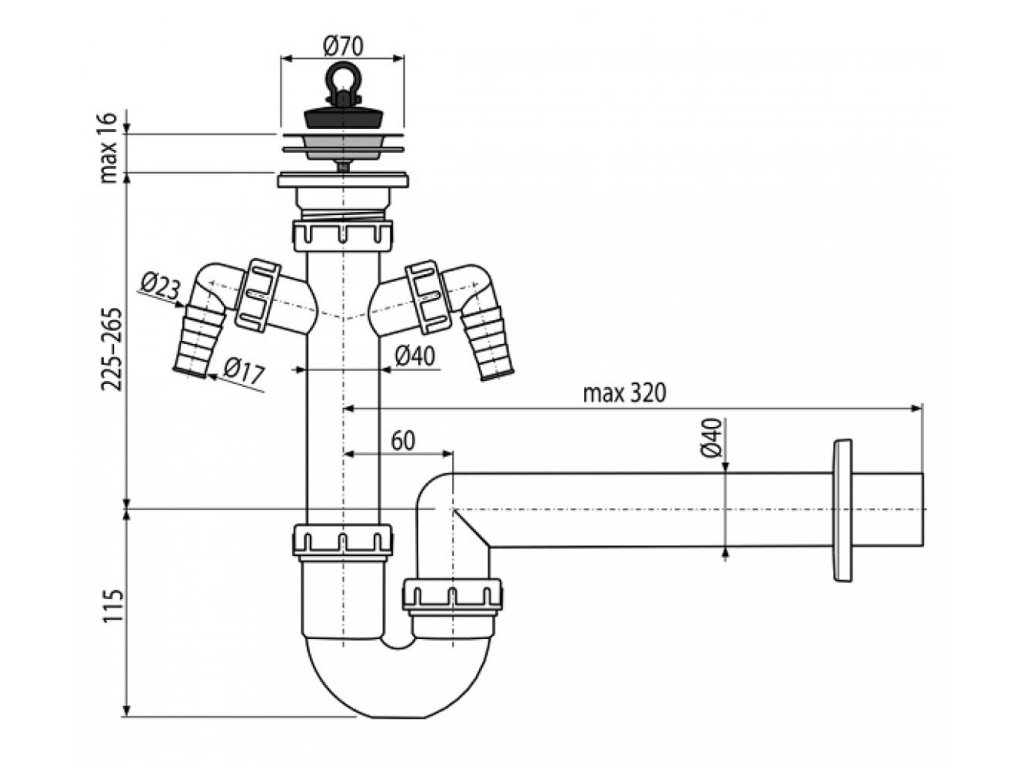Drezový sifón trubkový DN40 s nerezovou mriežkou DN70 a 2 prípojkami