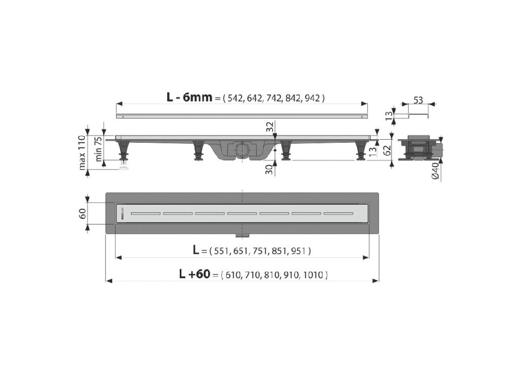 Sprchový žľab SIMPLE s nerezovým okrajom pre perforovaný rošt - 950mm