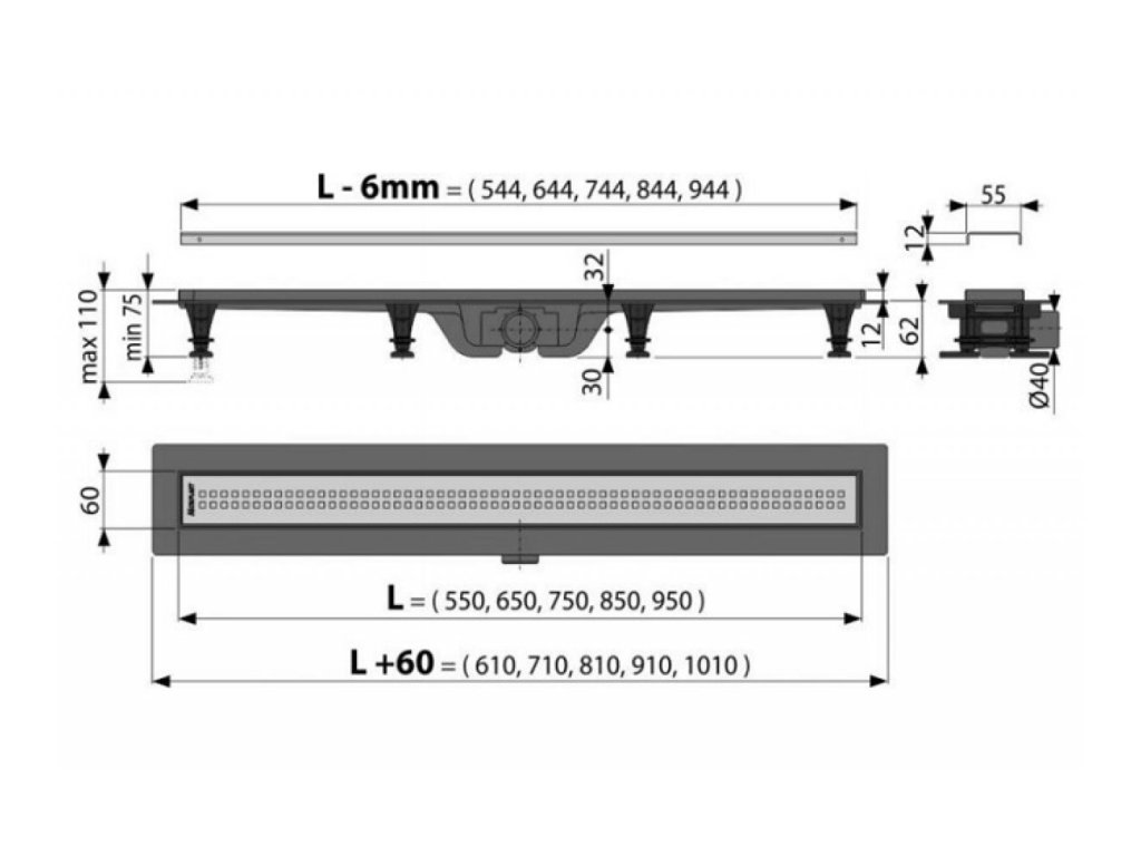 Sprchový žľab SIMPLE, s okrajom pre perforovaný rošt - dĺžka 550mm