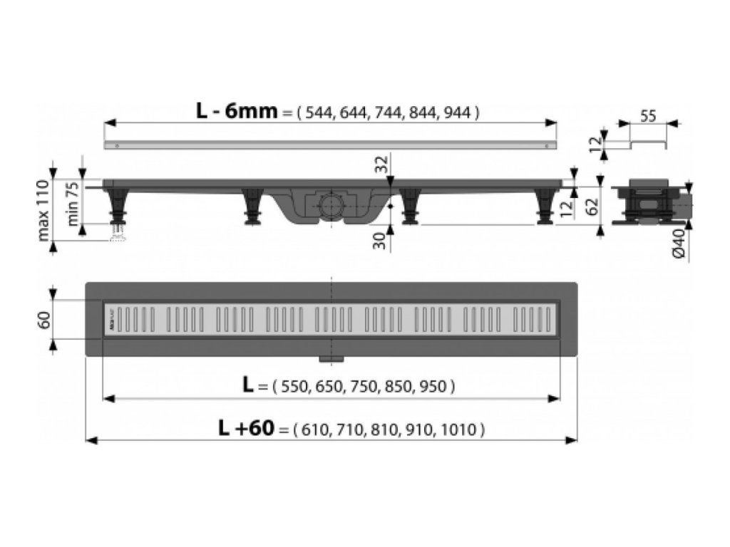 Sprchový žľab SIMPLE s okrajom pre perforovaný rošt, dĺžka 750mm