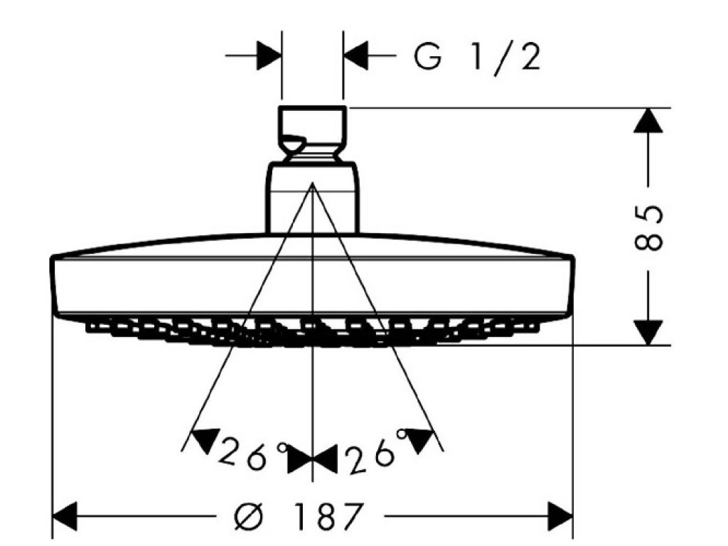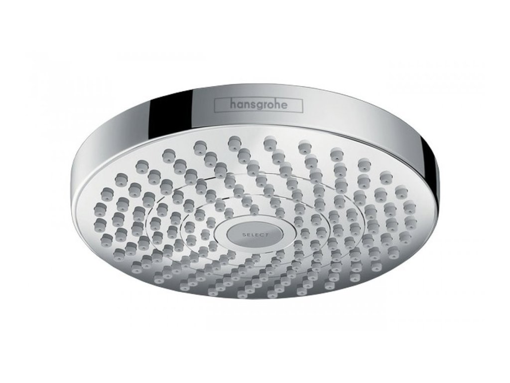 Sprchová hlavica Croma Select E s priemerom 187mm. S guľovým kĺbom umožňujúcim nastaviť uhol hlavovej sprchy. Možno namontovať na stenu alebo strop.