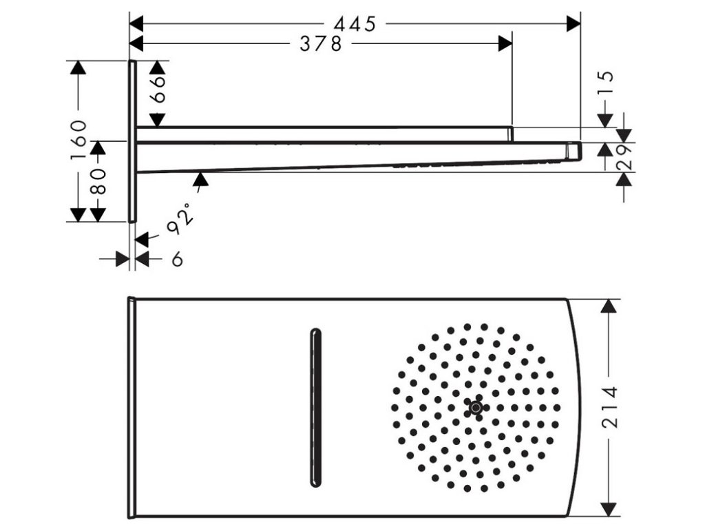 Hlavová sprcha RAINDANCE RAINFAL značky Hansgrohe. Súčasťou dodávky je horná sprcha a nástenný konektor.