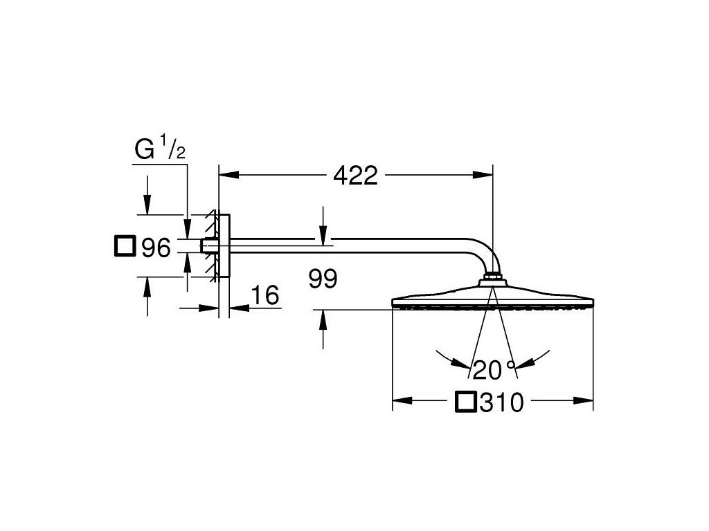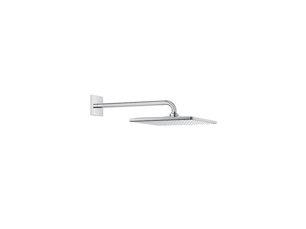 Kovová sprchová hlavica Rainshower Mono Cube značky Grohe, s priemerom 310mm, s otočným kĺbom, dodávaná so sprchovým ramenom dĺžky 422mm.
