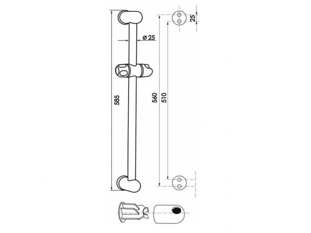 Sprchová súprava skladajúca sa zo sprchovej tyče dĺžky 60cm, kovovej sprchovej hadice dĺžky 150cm a ručnej 1-polohovej sprchy. Na tyči je umiestnená posuvná mydelnička a posuvný držiak sprchy.