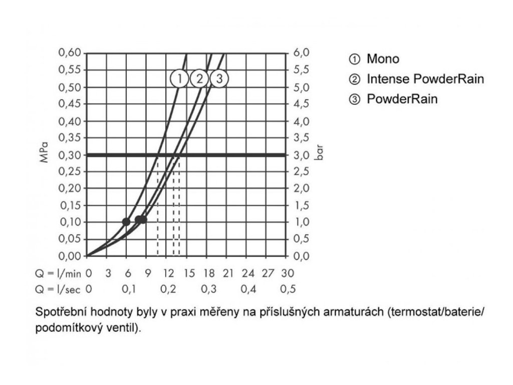 • ručná sprcha 3-polohová - 130mm. Pomocou tlačidla Select možno komfortne prepínať medzi 3 druhmi prúdu: PowderRain, Intense PowderRain, MonoRain.