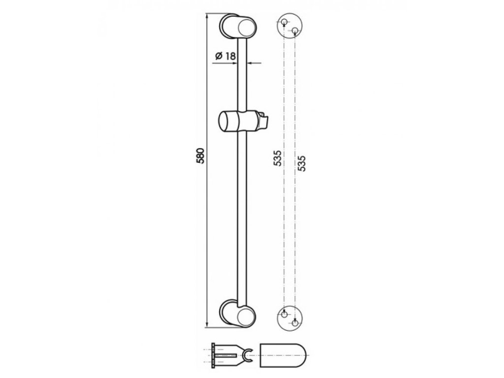 Sprchová súprava skladajúca sa zo sprchovej tyče dĺžky 60cm, plastovej sprchovej hadice dĺžky 150cm a ručnej 1-polohovej sprchy. Na tyči je umiestnený posuvný držiak sprchy.