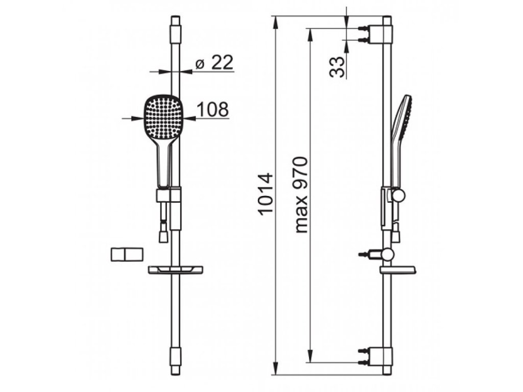 • sprchová tyč s nastaviteľnou roztečou úchytov, dĺžka 970 mm, o 22 mm.