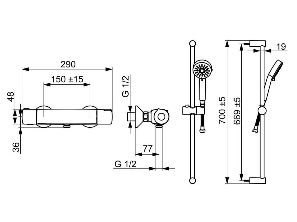 • termostatická stenová batéria s rukoväťou pre reguláciou prietoku vody a rukoväťou pre reguláciu teplotu vody. S ECO funkciou pre obmedzenie prietoku vody.