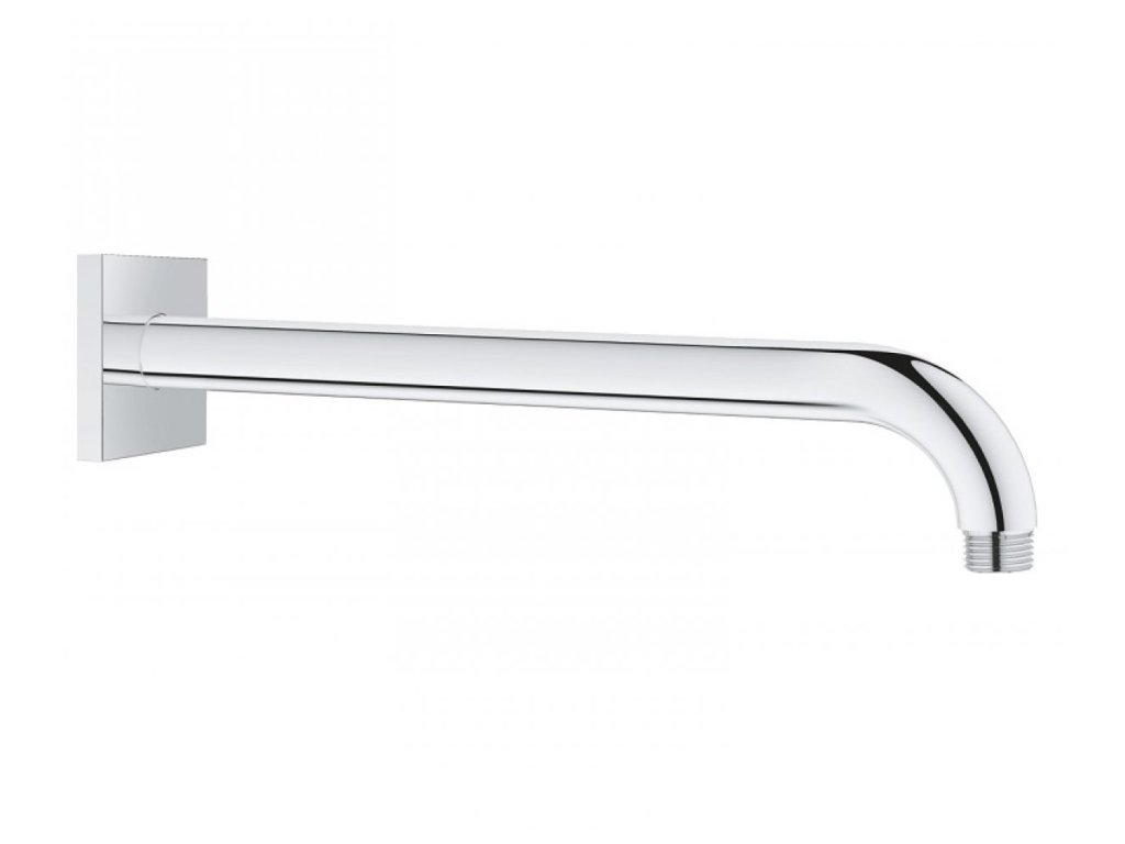 Nástenné kovové sprchové rameno Rainshower značky Grohe. S hranatou rozetou.