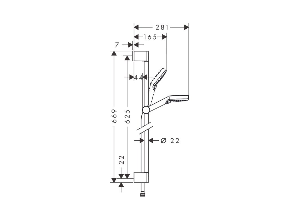 • sprchová tyč - dĺžka tyče 669 mm, priemer tyče s guľatým profilom 22mm, rozstup otvorov 625 mm;