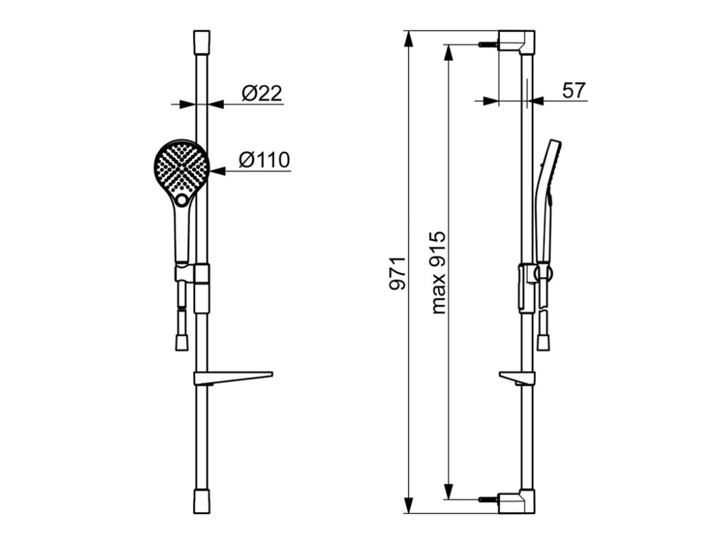 • sprchová tyč s nastaviteľným rozstupom úchytov, dĺžka 915mm;