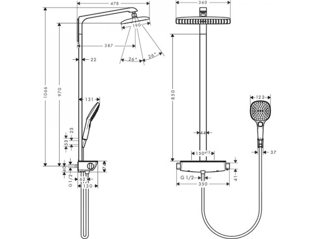 Sprchový systém RAINDANCE E, termostat s poličkou + hlavica 360x190mm