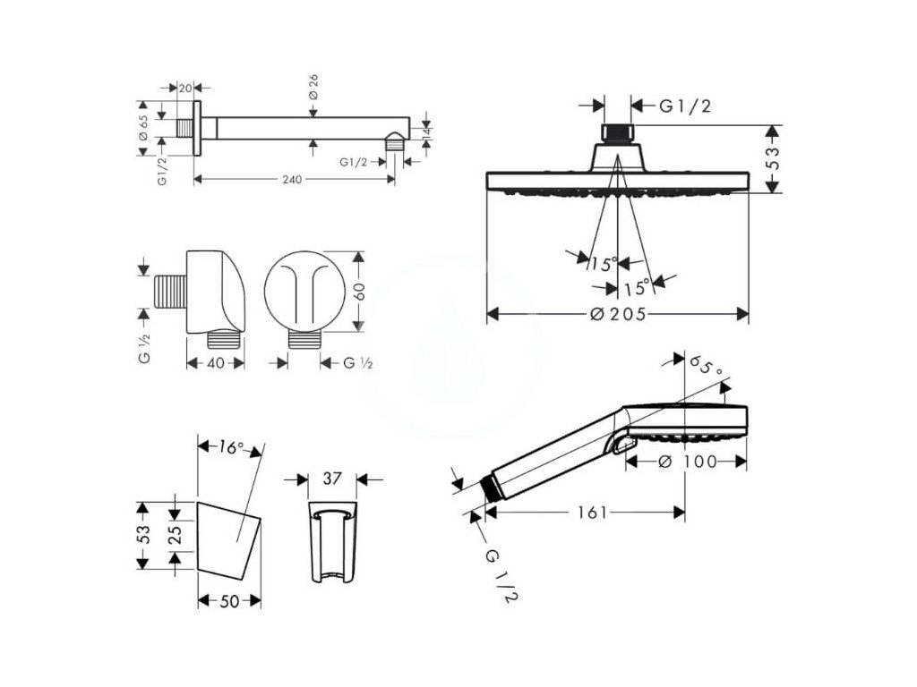 • sprchové rameno, dĺžka 240mm, pripojovací uhol 90°