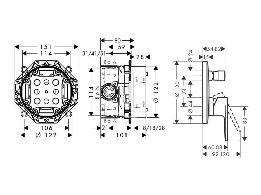 • ručná sprcha Vernis Blend Vario, Ø 100mm. Sprcha je 2-polohová, s režimami prúdu Rain a IntenseRain. Max. prietok 15,2l/min.