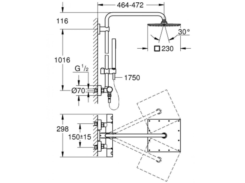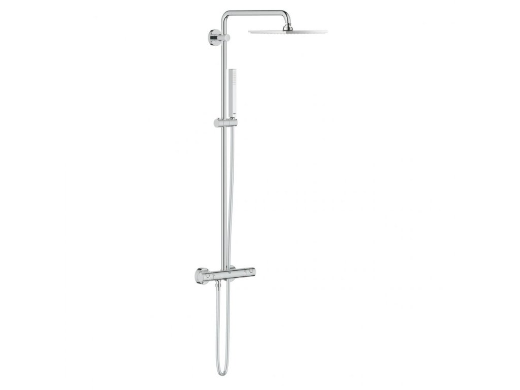 • termostatická sprchová stenová vodovodná batéria s technológiou GROHE AquaDimmer umožňujúcou jednoducho prepínať medzi hlavovou a ručnou sprchou.