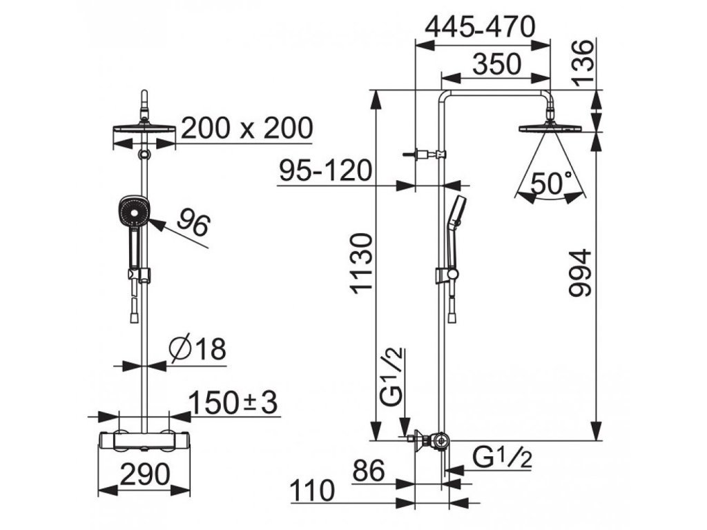 • sprchová hlavica, s otočným guľovým kĺbom, 200 x 200mm, výkyvná o 50°.
