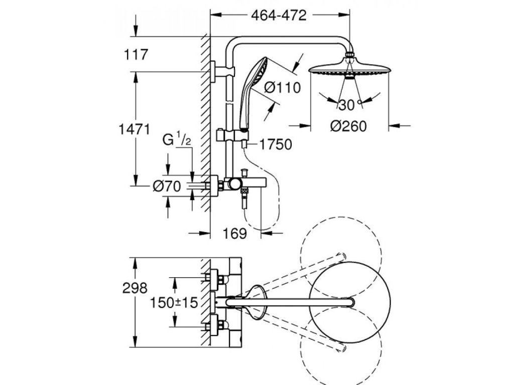 • termostatická sprchová stenová vodovodná batéria s technológiou GROHE AquaDimmer umožňujúcou jednoducho prepínať medzi hlavovou a ručnou sprchou.