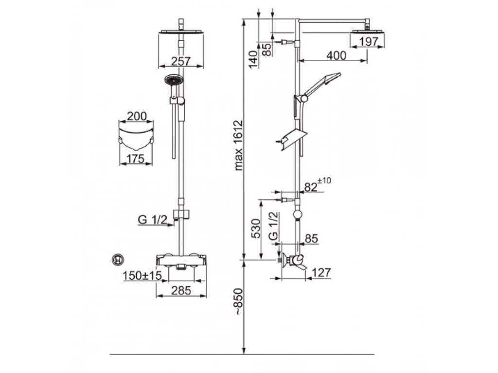 • sprchová tyč s nastaviteľnou roztečou úchytov, výška max. 1612mm