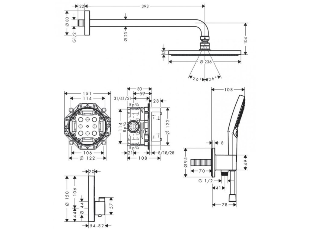 • termostatická podomietková vodovodná batéria ShowerSelect S, pre dve odberné miesta, ktoré možno pohodlne zapnúť a vypnúť pomocou tlačidla Select Start/Stop. Maximálny prietok pri 0,3 MPa: 29 l/23 l/min. Prietok horným výstupom: 25 l/min. Prietok dolným výstupom: 23 l/min.