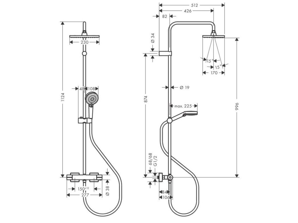 • sprchová tyč s dĺžkou 1124 mm a priemerom 19 mm