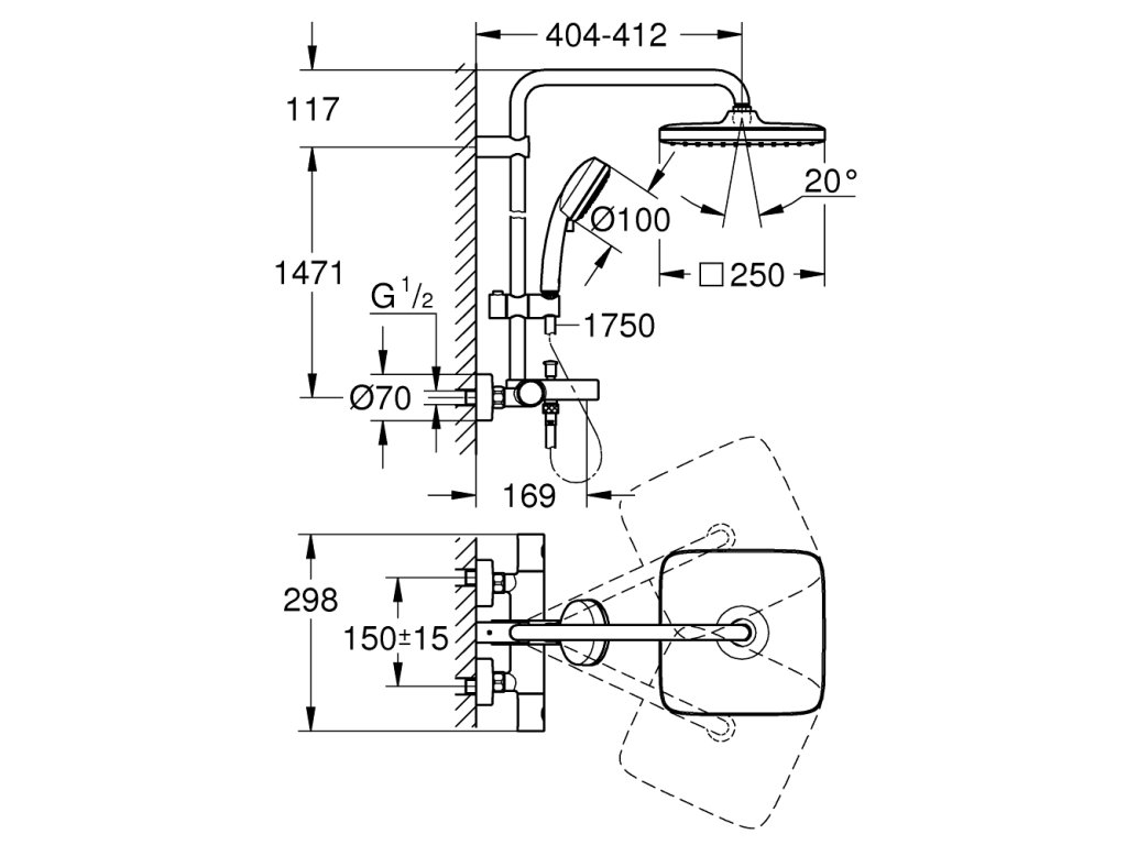 • hlavová sprcha Tempesta 250 CUBE s otočným guľovým kĺbom s uhlom otáčania ± 10°