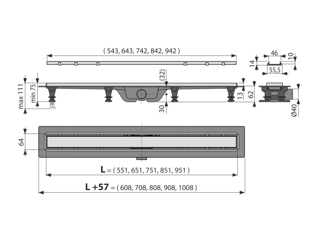 Sprchový žľab SIMPLE, nerezový okraj pre obojstranný rošt - 650mm