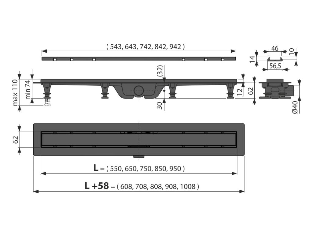 Sprchový žľab SIMPLE čierny, s okrajom pre obojstranný rošt - 650mm