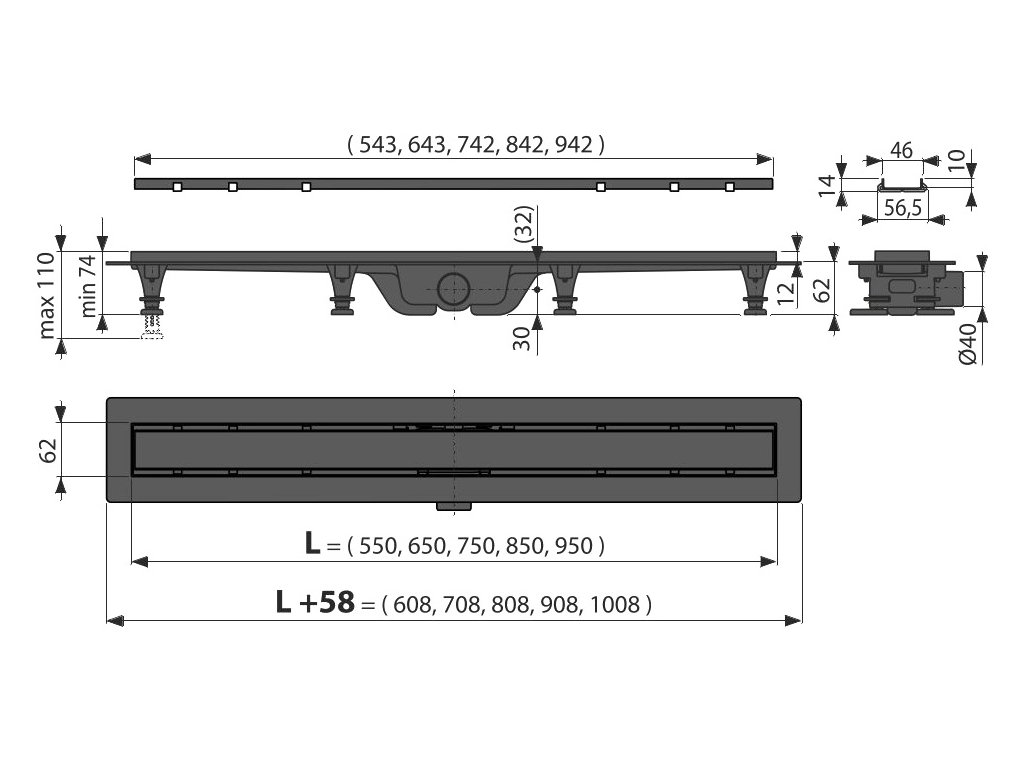 Sprchový žľab SIMPLE s okrajom pre obojstranný rošt - 850mm