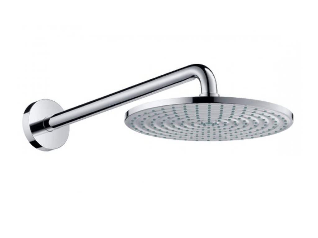 Tanierová horná sprcha Raindance S so sprchovým ramenom, s inštaláciou na stenu. Guľový kĺb umožňuje nastavenie uhlu hornej sprchy.