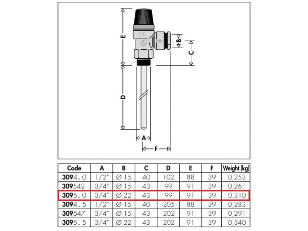 Teplotný a tlakový poistný ventil, 3/4”M x d22, nastavenie tlaku 3bary